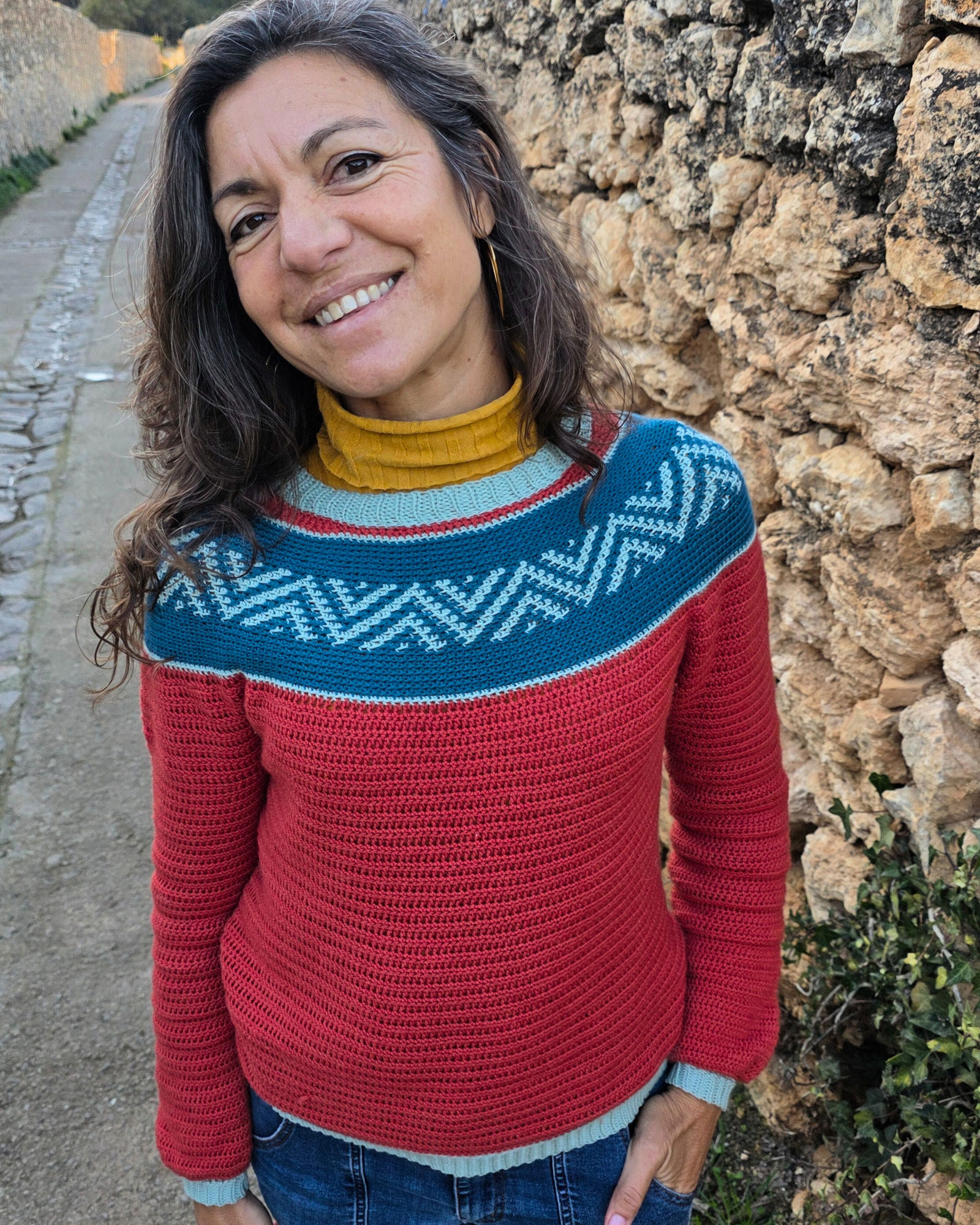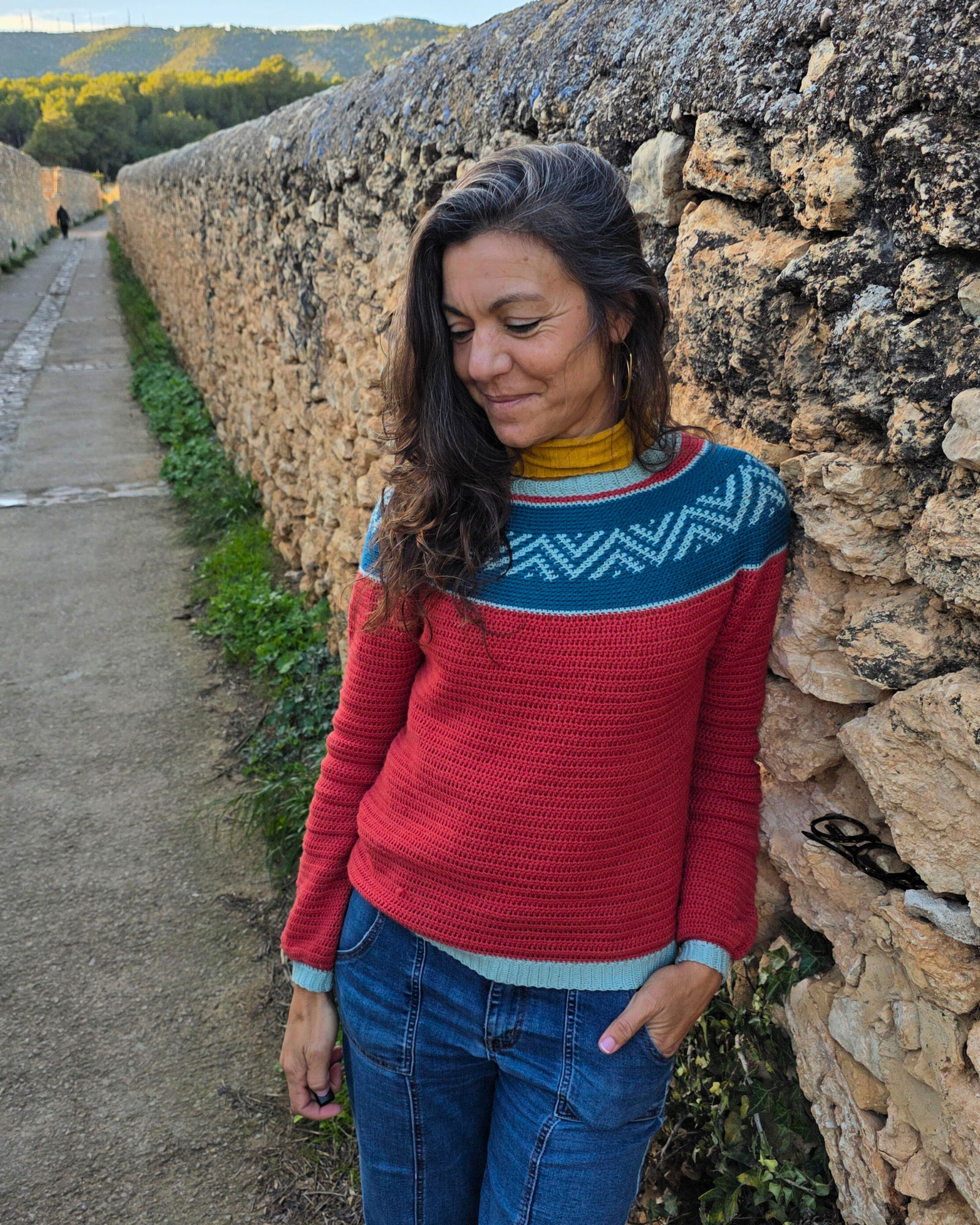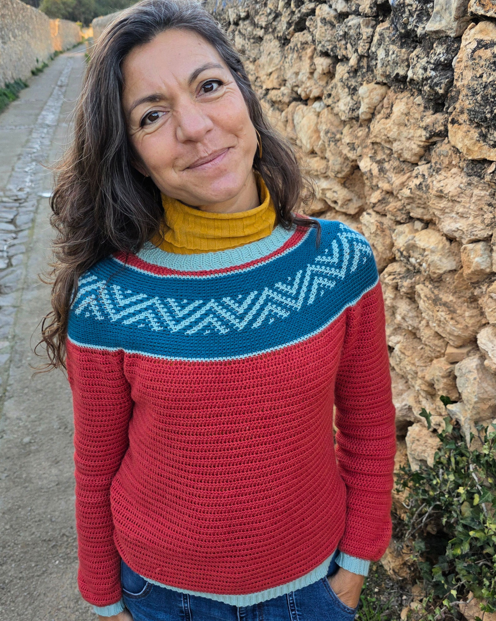 El Cholita Sweater es un jersey de ganchillo tejido de arriba hacia abajo (top-down), sin costuras, con un canesú circular decorado en tapestry crochet. Combina tradición y diseño contemporáneo en una prenda cálida, cómoda y muy favorecedora.