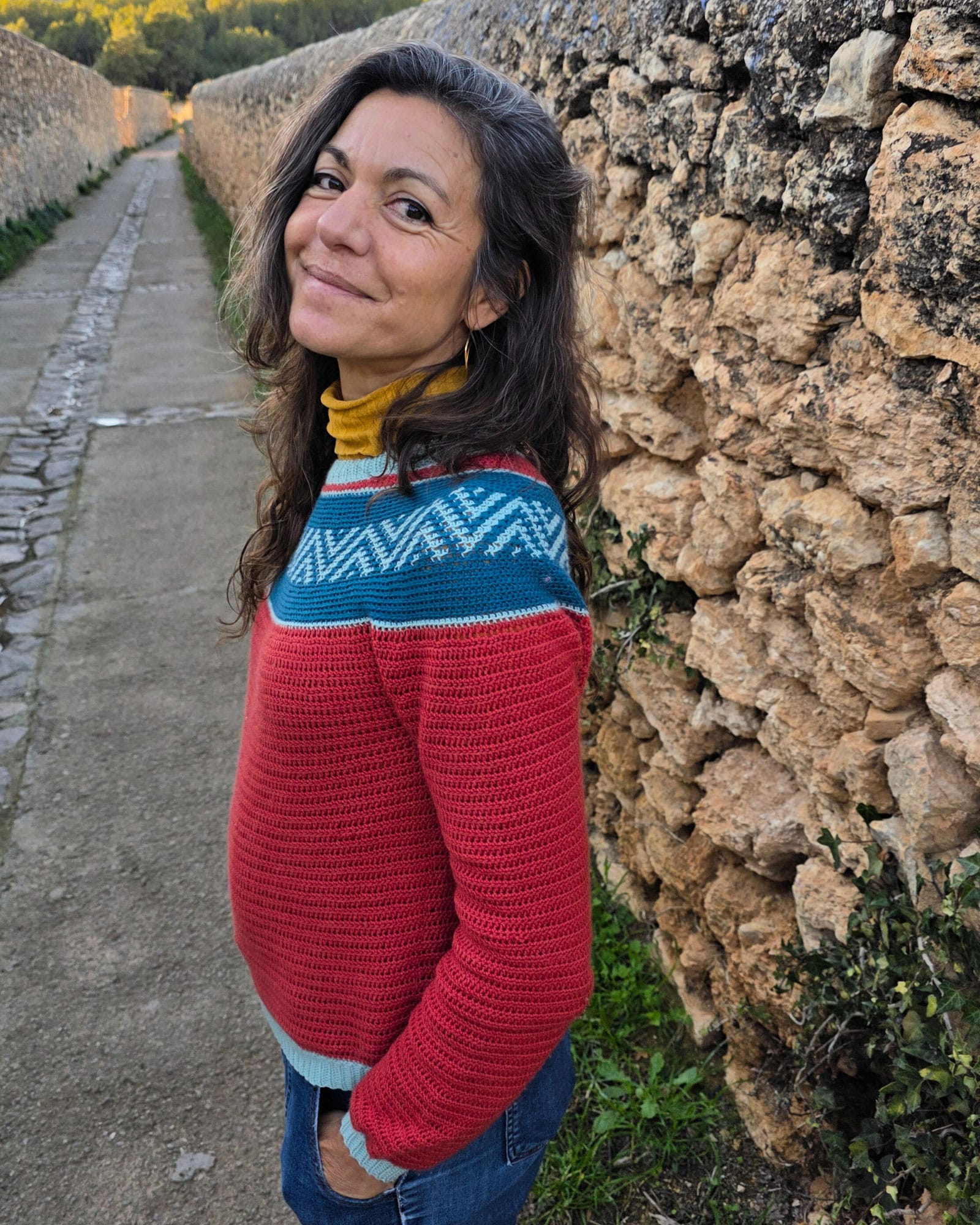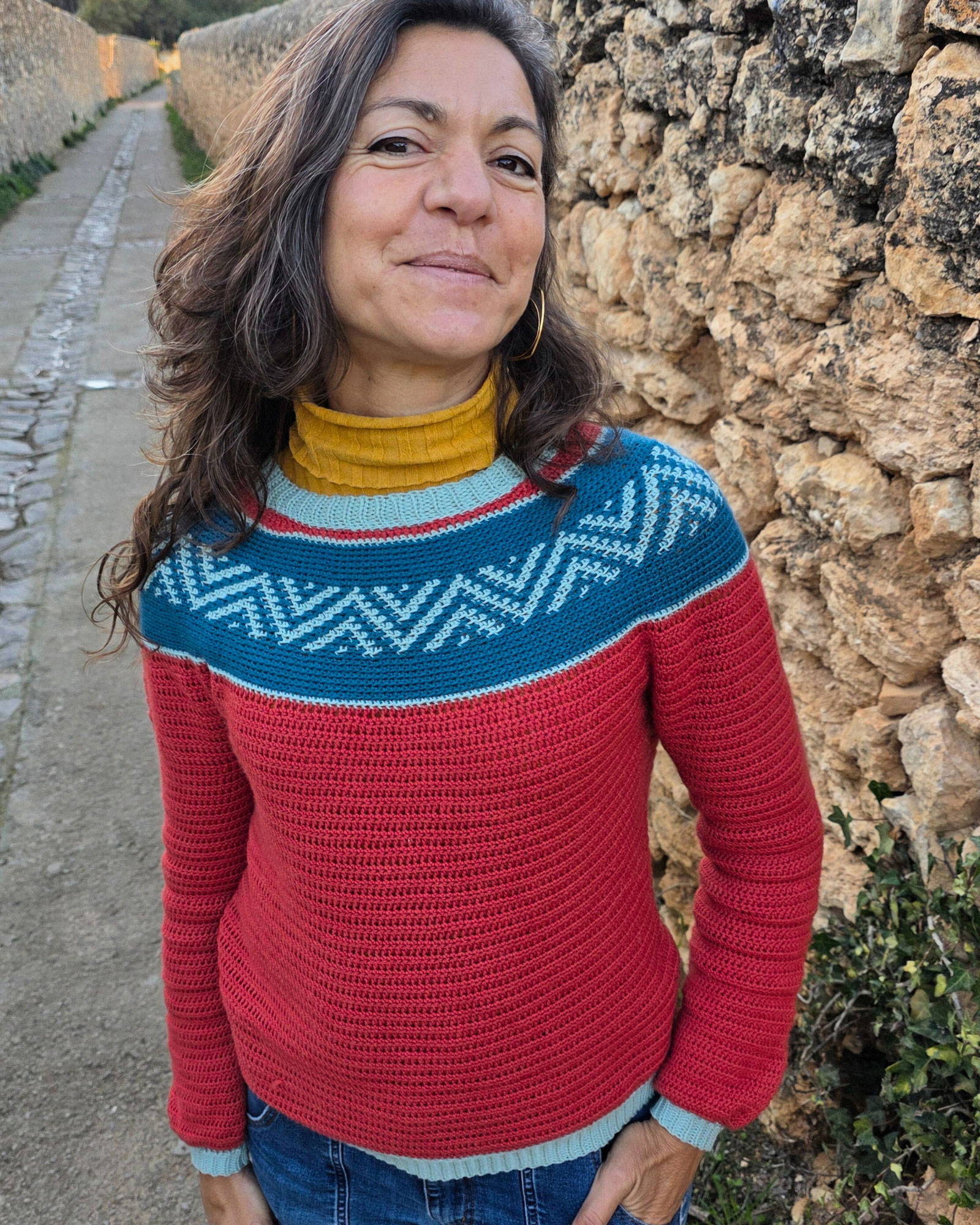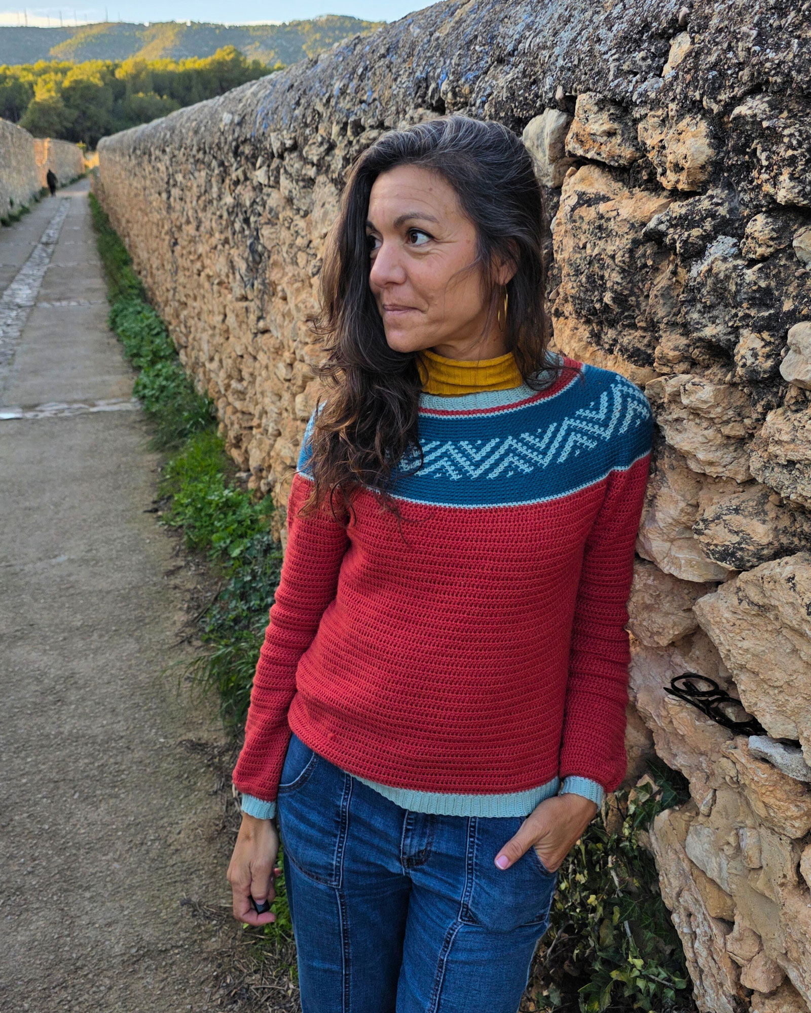 El Cholita Sweater es un jersey de ganchillo tejido de arriba hacia abajo (top-down), sin costuras, con un canesú circular decorado en tapestry crochet. Combina tradición y diseño contemporáneo en una prenda cálida, cómoda y muy favorecedora.