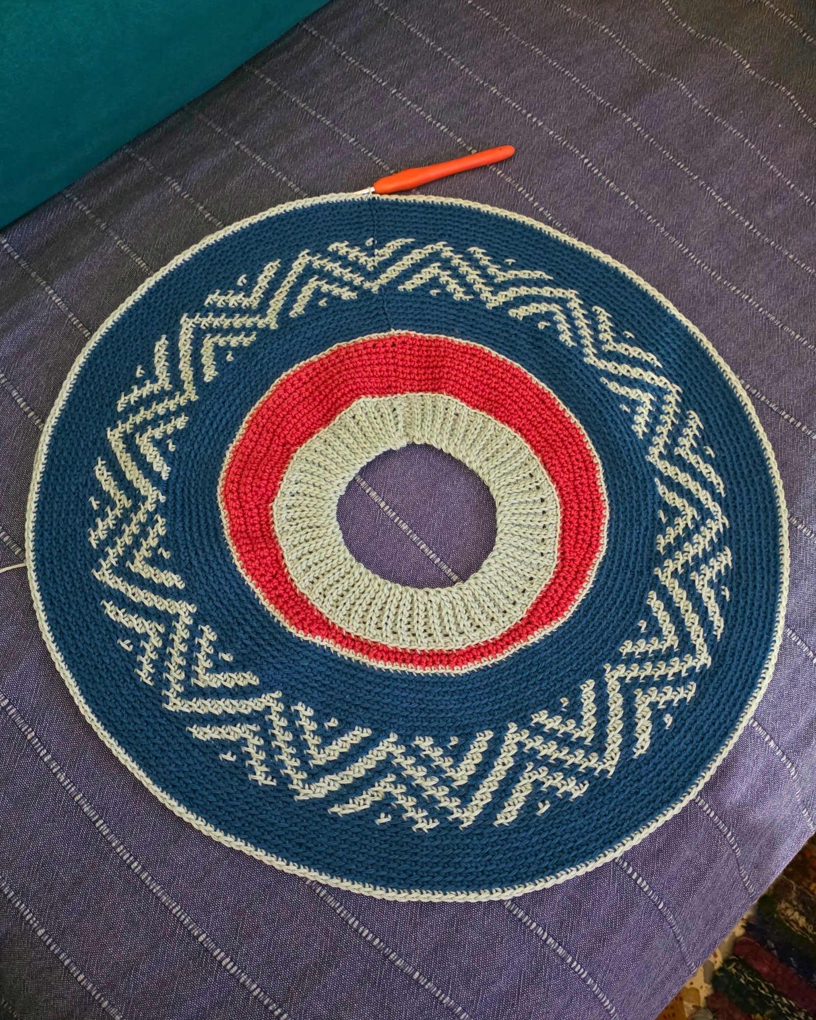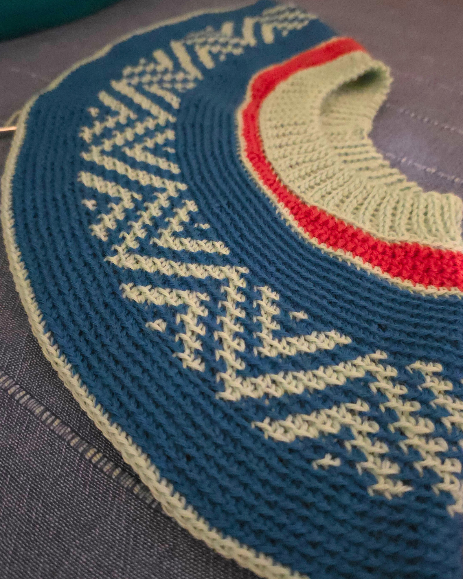 - Canesú circular, con vueltas cortas, zonas decorativas y tapestry crochet.